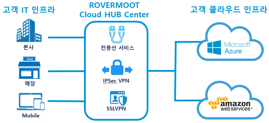 로버무트㈜의 클라우드 허브 서비스(Cloud HUB Service)는 사무실, 데이터센터 등의 고객 인프라 환경에서 Amazon AWS 또는 Microsoft Azure 등의 클라우드 서비스로의 안전한 연결을 제공하고 전용선, VPN 등 다양한 접속 방식의 클라우드 연결 서비스를 제공합니다.