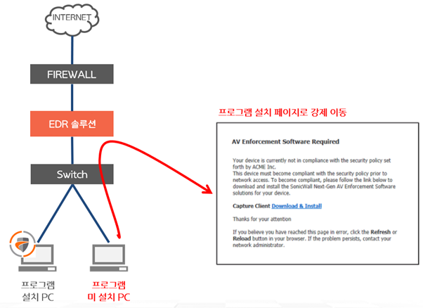 • 사용자들의 PC에 EDR 프로그램 설치를 강제하기 위해, 미 설치된 PC의 인터넷 사용 시에 설치 유도 페이지로 이동해 주는 기능 제공하여, 미 설치 시에 웹 사이트 접속 불가.