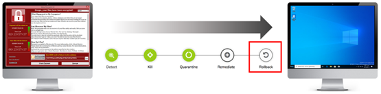 • 랜섬웨어 등의 위협에 대한 감염 시, Rollback 기능을 활용하여 감염 이전 시점으로 복원.
