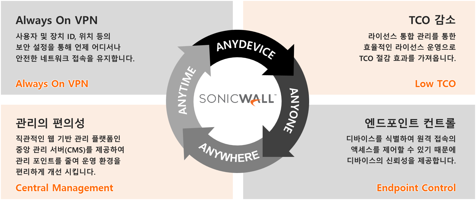 SonicWall SSL VPN은 사용자에게 언제 어디서나 중요한 데이터에 액세스 할 수 있도록 안정적인 원격 액세스를 제공하며, 사용하기 쉽고 관리하기 쉬운 VPN 솔루션입니다.