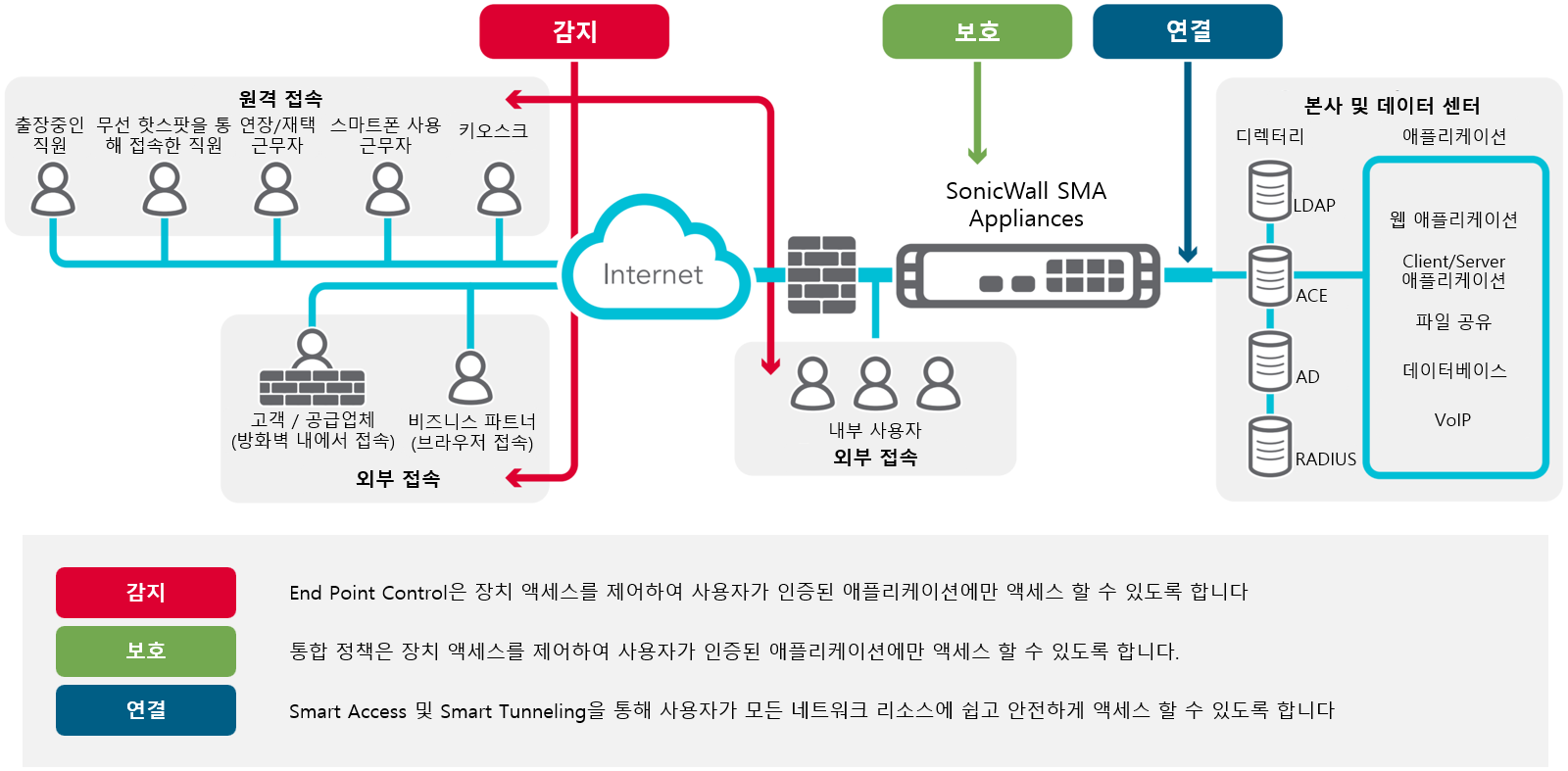SonicWall SMA시리즈는 세분화된 접근제어 정책 엔진, 컨텍스트 인식 장치 인증, 애플리케이션 레벨의 VPN 및 싱글 사인 온 (SSO)을 통한 고급 인증을 통해,